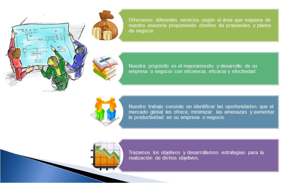 Ofrecemos diferentes servicios según el área que requiera de nuestra asesoría proponiendo diseños de propuestas y planes de negocios. Nuestro propósito es el mejoramiento y desarrollo de su empresa o negocio con eficiencia, eficacia y efectividad.